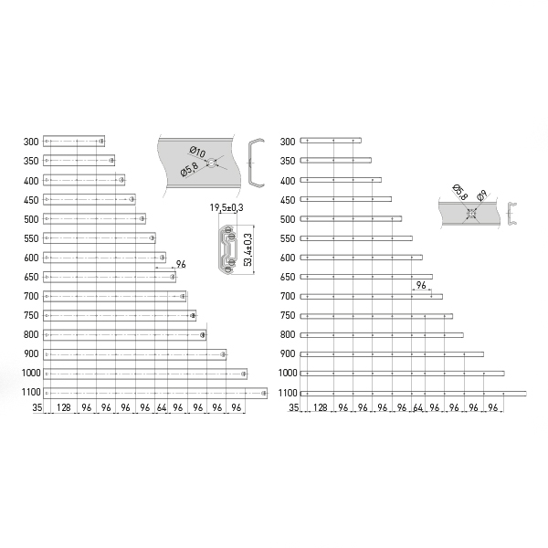 Disponível de 250mm ate 1100mm a cada 50mm até 800mm e depois passa a 100mm