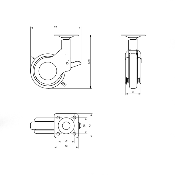 Os rodízios evitam arranhões no piso, não danificam o contrapiso, amortecem vibrações e permitem a movimentação rápida dos móveis. O rodízio 60 com freio é feito de aço e plástico, tem diâmetro de 60 mm e altura de 92,5 mm.