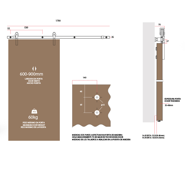 Sistema para porta de correr em madeira ou metálica de fixação à parede.